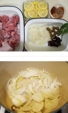 摩洛哥咸檸雞的材料:咸檸檬2-3片,洋蔥1顆,大蒜1瓣,綠橄欖10顆,葡萄干或無花果干,杏桃干1小把,大雞腿兩隻切大塊約800g,北非混合香料1大匙,水半杯,橄欖油1大匙,鹽
