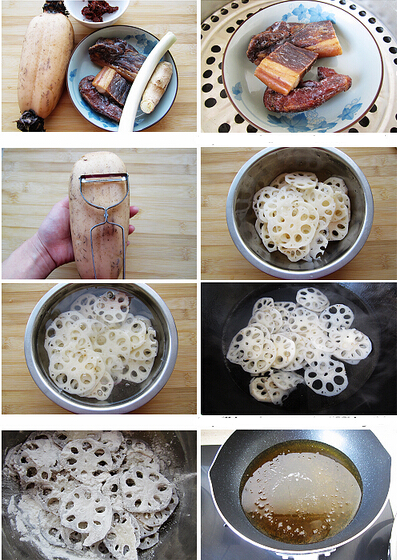 2.坐鍋倒油,油六七成熱后,將蓮藕片下鍋炸,炸至蓮藕片表面金黃,撈出瀝油,另外將蒸好的臘肉切成片