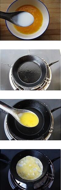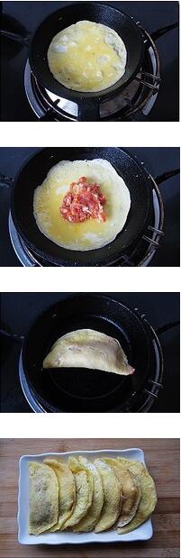 5.小鍋中擦少許油,燒熱后放入1湯匙的蛋液,旋轉(zhuǎn)鍋?zhàn)邮沟耙轰亜?,放入合適的內(nèi)餡,等到蛋皮凝固,然后將上下兩邊對(duì)折,一個(gè)蛋餃就完成啦