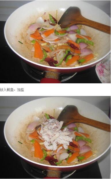 3坐鍋倒油,放入干辣椒;花椒5粒;姜蒜爆香,放入胡蘿卜 洋蔥 青椒,翻炒片刻,再放入魷魚,加鹽翻炒均勻,最后放醬油;蔥段翻炒均勻即可出鍋裝盤家常菜譜