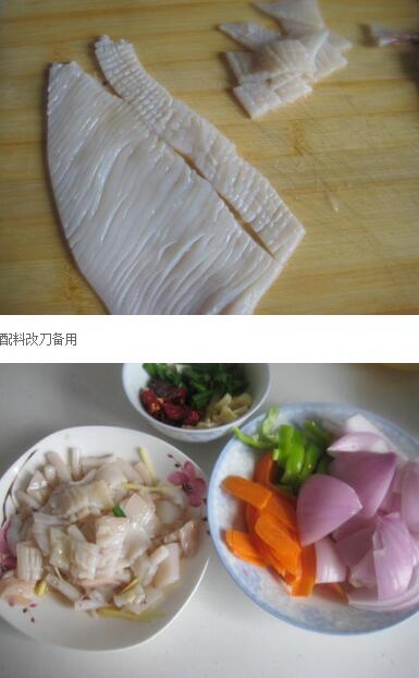 1.魷魚洗凈撕掉黑膜處理干凈后,將魷魚劃十字花刀,然后放入料酒和姜絲腌制幾分鐘,洋蔥,柿子椒,胡蘿卜洗凈改刀備用