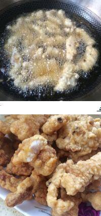 3.鍋里倒入足量植物油,六成熱時,放入掛好糊的肉片,炸至兩面金黃時就可撈出,在肉片都炸好了之后,再大火加熱油鍋,把炸好的酥肉再復(fù)炸一次即可。