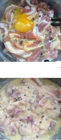 1.五花肉洗凈去皮切成長的薄片.放入干凈的碗中用雞蛋 、鹽,十三香、生抽,料酒拌勻后加入姜末和蔥末拌勻腌20分鐘。