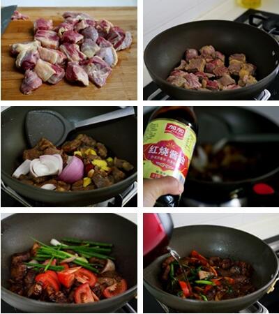 2.取一炒鍋,不用油,用中小火將牛肉炒出水分,炒出的水用廚房紙沾去,當(dāng)水分差不多炒出時,將備好的調(diào)料除西紅柿和小蔥都放入鍋中,繼續(xù)保持中小火炒,當(dāng)冰糖炒融化加醬油炒均,放入西紅柿和小蔥,炒出香味加入熱水,與肉平齊。