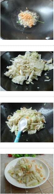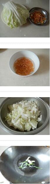2. 坐鍋倒油下入油炒香蔥,加入蝦米炒香,然后加入少許泡蝦米的水稍煮幾秒,再快火翻炒,白菜炒軟熟,加入精鹽炒勻即可出鍋