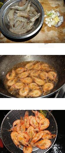 2.鍋里放油,燒至5成熱時(shí),將蝦入油里爆1-2分鐘撈起,把炸好的蝦撈出瀝干油。