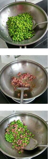 2.坐鍋倒油,油熱后倒入毛豆煸炒1-2分鐘,至變色后盛出