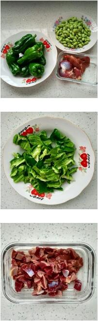 雞雜炒毛豆的材料:辣椒5-6只,毛豆300克,雞雜雞胗、雞肝、雞心各1個,生姜,料酒,鹽
