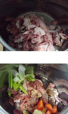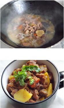 2.肉放鍋內(nèi)加水,沒過牛肉,加除鹽外的所有調(diào)料入鍋,先大火燒沸轉(zhuǎn)小火慢慢燉至肉熟,加土豆繼續(xù)燉至肉軟爛后加番茄,出鍋前加鹽調(diào)味即可