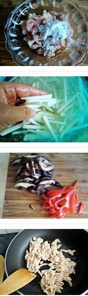 1.香菇提前用清水浸泡,里脊肉切絲加入鹽,糖,料酒,胡椒粉,淀粉拌均勻腌制備用,山藥去皮切絲用淡鹽水浸泡,泡好的香菇切條,紅椒切絲。
