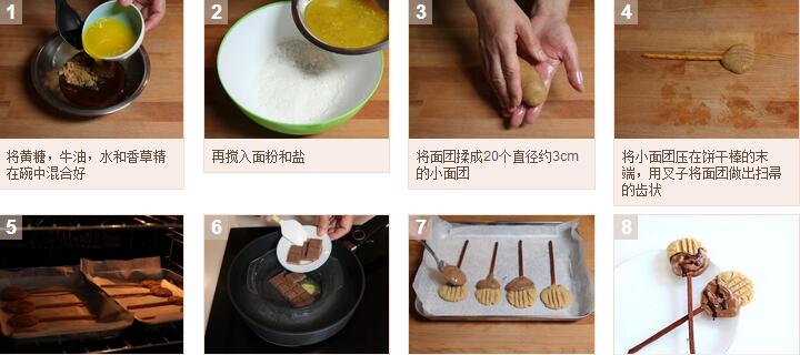 女巫的掃帚的材料:黃糖1/2杯,牛油1/2杯,多功能粉1 1/2杯,鹽1/8茶匙,水2湯匙,香草精1茶匙,10根百力滋或者其他的餅干棒,植物起酥油2茶匙,半甜朱古力碎2/3杯