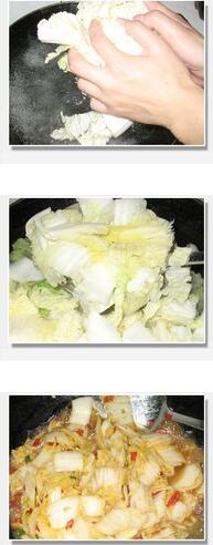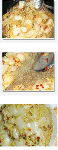 3.鍋中放底油,油熱,放姜絲,蔥花,剁碎辣椒,爆香一下。倒入焯好水的白菜,加鹽煸炒,使白菜癟下去,加點(diǎn)醬油,醋,然后蓋蓋子燒個1分鐘,然后加泡好的粉絲,不用刀切段了,倒入鍋中,自己用鍋鏟把粉絲粉兩段就可以了。再加點(diǎn)鹽,味精,翻炒一分鐘就可以出鍋了