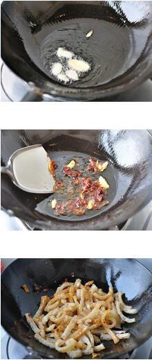 3.起油鍋,放入姜片爆香。放入一湯匙紅油豆瓣醬,炒出紅油。倒入切好的炸豬皮,翻炒均勻。把切好的青椒段倒入鍋里炒勻。放入洋蔥,快速翻炒。調(diào)入適量精鹽。沿鍋邊烹入兩湯匙陳醋,過火,翻炒均勻即可出鍋。