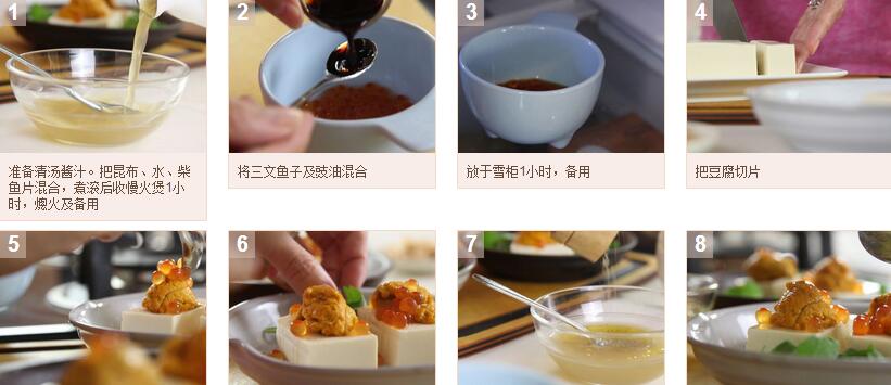 海膽凍豆腐配清酒三文魚籽的材料:豆腐1包350g,海膽30g,火箭菜30g,鮮三文魚子60g,豉油3湯匙,清酒2湯匙,鹽半茶匙,胡椒粉半茶匙,柴魚片1茶匙,日式清湯醬汁,昆布2片,水2升,柴魚片400g