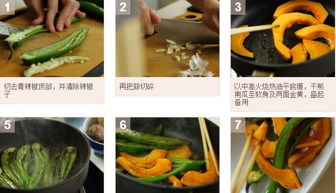 煎煮南瓜尖椒的材料:南瓜100g,青辣椒4條,蒜頭2瓣,糖15g,水3湯匙,豉油1湯匙,油2湯匙 煎煮南瓜尖椒的做法:1. 先削去南瓜皮,再切成1寸長(zhǎng)。切去青辣椒頂部,并清除辣椒子,再把蒜切碎。2. 以中高火燒熱油平底鑊,干煎南瓜至軟身及兩面金黃,盛起備用。