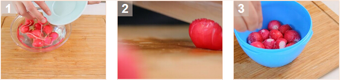 1:櫻桃蘿卜洗凈去頭尾,櫻桃蘿卜切片不切斷,橫豎開(kāi)刀,開(kāi)好刀的蘿卜放入有蓋可密閉的容器內(nèi),撒約1克鹽腌制約10=15分鐘