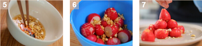 糖醋櫻桃小蘿卜的材料:櫻桃蘿卜10-15個(gè),花生10克,蒜2瓣,糖1/4茶匙,鹽1/4茶匙,米醋10克,鮮醬油5克,辣椒油2~3克,香菜葉1片