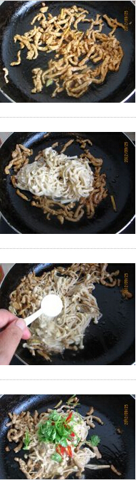 4.鍋中放少許油(如果炒金針菇時放油多,這時就不必放了)炒香蔥姜,加入肉絲快速翻炒,炒至肉變白,加入料酒,再次炒勻后,加入,醬油,再次快速炒勻,放入炒好的金針菇,加入,鹽,再次炒勻后放少許香菜辣椒段點綴。