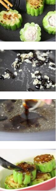 4.坐鍋倒油下放入蒜蓉和豆豉爆香,約需要30秒,再加入水、醬油和糖燉煮。,最后將醬汁淋在炸好的苦瓜就可以了。