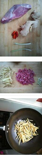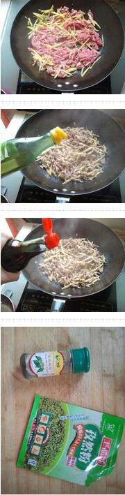 2..炒鍋加熱,下油,下姜絲辣椒和蔥頭煸香,下入牛肉絲翻炒,牛肉微熟脫色,下點(diǎn)料酒,下點(diǎn)醬油調(diào)色,下點(diǎn)胡椒粉和孜然粉調(diào)味,加蓋煮熟出鍋