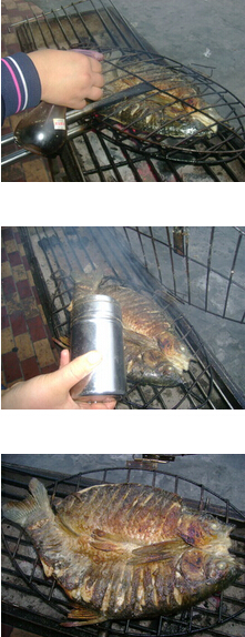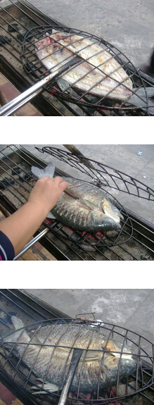 3.用夾魚(yú)的夾子把魚(yú)夾到烤架上開(kāi)始烤了,先烤魚(yú)的里面,現(xiàn)在烤烤外面,等里外都受點(diǎn)熱后再刷油,現(xiàn)在開(kāi)始刷油了,里外都要刷油哦,要邊刷邊烤做好幾遍,刷油后要烤一烤,