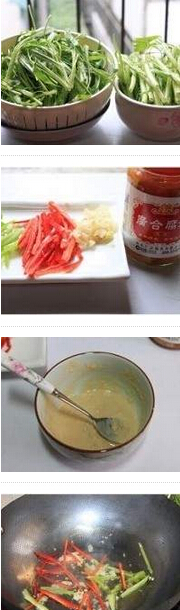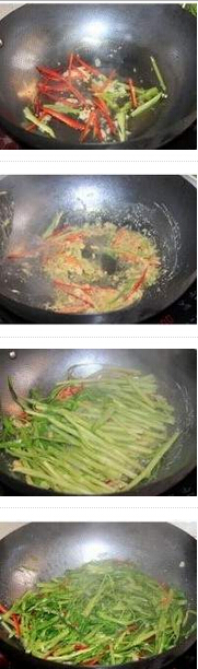 2.坐鍋倒入適量油,油要比平常炒菜多一點(diǎn),通心菜比較吃油,油不夠了很容易變黑,油熱時(shí)候,倒入一半青紅椒絲,蒜蓉,爆香后加入腐乳醬翻炒,腐乳炒出香味后,倒入通心菜梗,大火翻炒,1分鐘內(nèi)即可斷生,菜梗將要全部斷生時(shí),加入菜葉部分和剩余的青紅椒絲翻炒均勻,調(diào)入鹽炒勻即可裝盤食用。