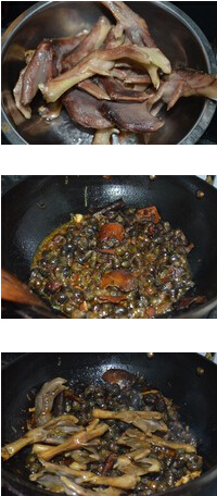 3.起油鍋,放上香料包,大蔥段,姜蒜,炒香后倒入夾好的田螺,翻炒幾分鐘后加入筍,鹽(多些,因為加水后就會變淡),蠔油翻炒。加入少許水煲一下。翻炒后加入鴨腳進行翻炒,炒好又加入少許水翻炒,如果太淡就繼續(xù)加入耗油或鹽,有點咸就對了,加入少許白砂糖,豆鼓,腐乳,紫蘇翻炒,煲3分鐘左右。