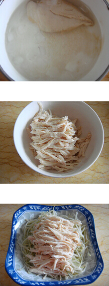 3.再用清水加八角,桂皮,大火燒開后,倒適量料酒,放入雞肉,15分鐘后,撈起放進(jìn)冰水中過涼2分鐘,撈起把它撕成雞絲