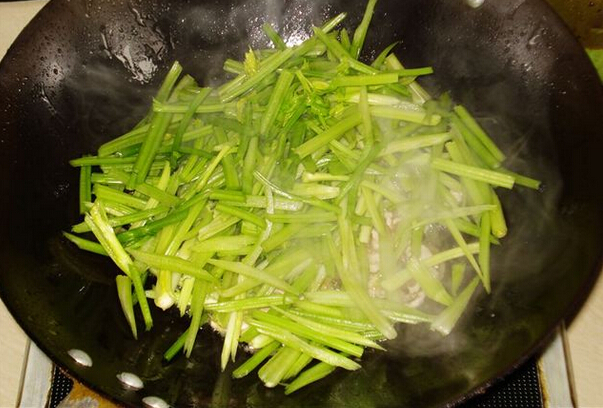 3、加入茶干翻炒,加點水,然后放入芹菜翻炒均勻