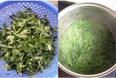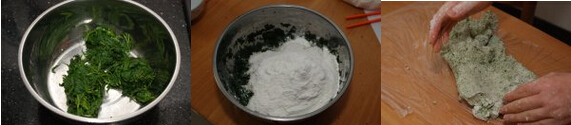 1.新鮮艾草葉,留葉去柄,開水中汆燙后撈起,切成小段,加入適量的水料理機打成糊。