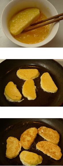 3.雞蛋放少許鹽,打散。 4.將切好的的饅頭片蘸滿蛋液。 5.平底不粘鍋內(nèi)放少許油,油熱后將饅頭片逐個放入。 6.中小火,一面煎好后翻面就做好了。