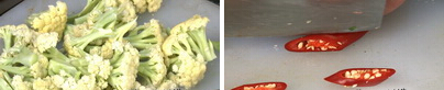 1、青、紅杭椒洗凈切成小段;菜花去根,切成小塊,洗凈后控干水分。