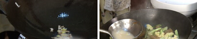6、鍋燒熱,加入一勺涼油滑透,將油倒出,留少許底油,下入蔥花、片炸香,調(diào)入生抽,下入菜花和蟄頭炒勻,將調(diào)好的湯汁攪勻后倒入鍋中,翻炒均勻。
