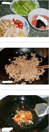 香干芹菜炒肉絲的材料:瘦肉300克,芹菜50克,香干200克,姜,泡椒,食用鹽,干淀粉,蠔油,雞精,色拉油,清水少許