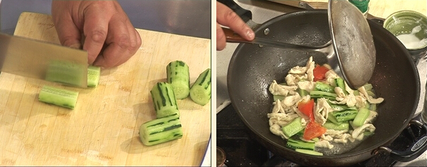 4.鍋中留底油依次下入姜片 蒜片 蔥段熗鍋 5.再烹入料酒加熱水,加鹽,糖,雞精調(diào)味兒,勾一點(diǎn)薄芡,然后放入雞片和青瓜 6.最后把蟄頭放入70度的水中焯至一下立刻放入鍋中翻炒即可