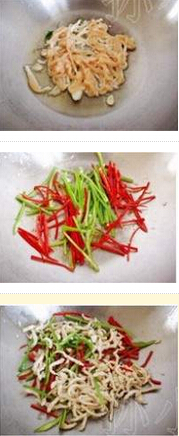 4.將鍋洗凈后置火上,放油,將青紅椒絲放入,將其煸炒一會兒,放入鹽調(diào)味
