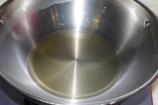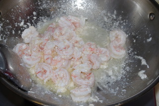 6 將蝦仁慢慢倒入燒熱的鍋內(nèi)