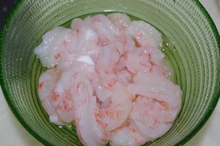 2 蝦仁用刀開背,取凈蝦線,放入一個蛋清和適量鹽,攪拌均勻后放一旁入味15分鐘