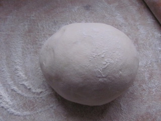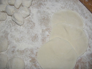 7 面團(tuán)揪成小劑子,搟成圓形的餃子皮。
