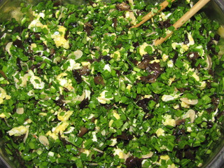 6 放到拌好的雞蛋.木耳盆里加鹽.味精.姜末.花生油攪拌均勻,素三鮮餡就好了。