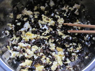 4 和蝦皮一塊拌到炒好的雞蛋里。