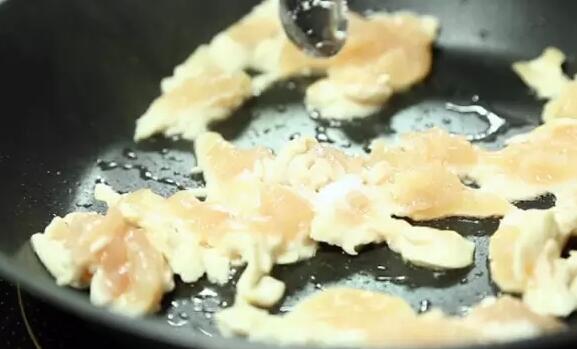 將雞胸肉切成片狀,倒入鍋中加半勺鹽和胡椒粉爆炒1分鐘至7-8成熟就可以出鍋了。