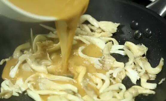 2.將平菇倒入油鍋中翻炒,2分鐘后把調(diào)好的醬汁倒入鍋中,迅速攪拌(因?yàn)榈矸鄣年P(guān)系怕它會(huì)粘在鍋底)炒到醬汁粘稠。