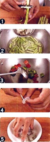 6.坐鍋倒底油至六成熱,下入蔥花炒出香味后放人百合搬和蘆筍條,用旺火略炒片刻,再放入青椒塊、紅椒塊和蝦球翻炒均勻,最后加人精鹽、味精、白糖調(diào)好口味,用水淀粉勾薄芡,淋入香油翻炒均勻即可出鍋