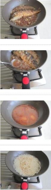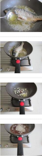 2. 坐鍋倒油燒熱倒6成,下鯉魚連續(xù)上火幾次,用勺子不停的往鯉魚身上澆熱油,待魚浸透油后,再上大火,油溫升高后,撈出魚瀝油
