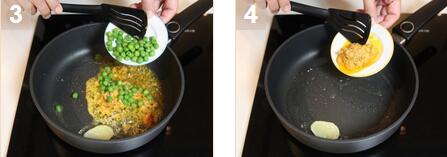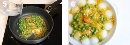 2. 在油鑊中高火加熱適量油。加入姜,蟹黃和青豆翻炒。加入調(diào)味料攪勻。