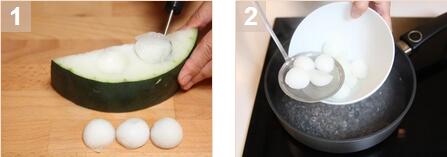 1. 用湯匙將冬瓜挖出一個(gè)個(gè)小冬瓜球(不要帶皮)。出水4分鐘直到冬瓜全熟,然后取出瀝干,放入盤中。