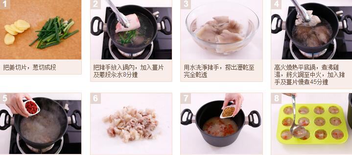 豬手凍的材料:豬手600g,蔥50g,50g,雞湯250毫升,水500毫升,杞子30g,桂花5g