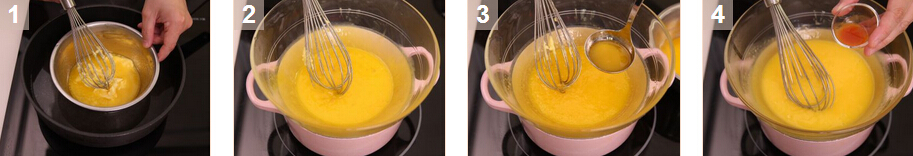 2. 將蛋黃、檸檬汁及鹽加入攪拌碗內(nèi),打發(fā)均勻后倒進(jìn)碗內(nèi),放入雙層蒸鍋,把水加熱慢慢煮,然后慢慢加入熱溶了的牛油,并與蛋黃混和直至醬汁濃稠。加入少許辣椒汁拌勻,放在一旁備用