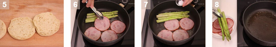 班尼迪克蛋的材料:英式松餅2個,加拿大式熏豬肉4片,蘆筍60克,雞蛋4只,芫茜碎,白醋,牛油 (軟身),